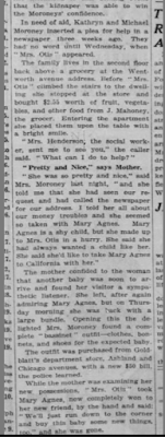 The next day, May 15, 1930, Julia Otis came back to the Moroney home, this time with more generous gifts, including clothes and a new bassinet, purchased from Goldblatts, for the new baby that would be coming soon. Catherine Moroney felt comfortable with the woman who was offering help to her family, so when Julia Otis asked if she could take Mary Agnes to the store for some new clothes, Catherine Moroney gave her permission. And that was the last time Catherine Moroney would ever see Mary Agnes.